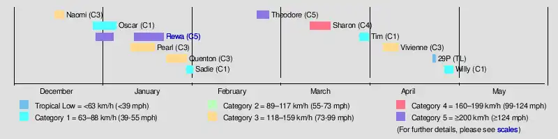 Rewa | 26 December – 23 January | Category 5 severe tropical cyclone | 205 km/h (125 mph) | 920 hPa (27.17 inHg) | Melanesia, Eastern Australia, New Zealand | Unknown | 22 | |