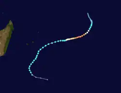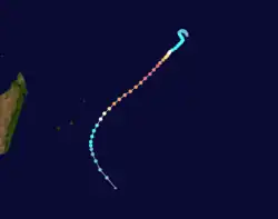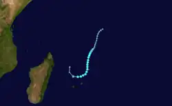 On February 22, a tropical disturbance formed southwest of Diego Garcia. It moved westward, intensifying into Tropical Storm Ingrid on February 24.[14] That day, the JTWC began issuing advisories on the storm as Tropical Cyclone 13S.[3] Ingrid turned more to the southwest while passing just east of St. Brandon,[14] where winds reached 56 km/h (35 mph).[15] After continued intensification, the storm became a tropical cyclone on February 26 while passing between Mauritius and Rodrigues.[14] On Mauritius, winds gusted to 91 km/h (56 mph) at Sir Seewoosagur Ramgoolam International Airport,[15] and the storm produced high waves.[16] On the next day, the MFR estimated peak winds of 150 km/h (95 mph), while the JTWC estimated winds of 185 km/h (115 mph). Ingrid turned to the southeast and weakened,[14] becoming extratropical on March 1.[17]