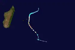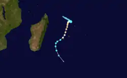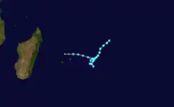 The same overall system that spawned Josta also produced a disturbance on March 6 off the east coast of Madagascar. While drifting southeastward within a trough, the system slowly organized until becoming a tropical storm on March 7,[1][20] the same day that the JTWC classified it as Tropical Cyclone 17S.[3] On the next day, the system was named Kylie as it meandered to the north of Mauritius without further strengthening. The convection organized on March 10 into a central dense overcast,[1] and the next day attained peak winds of 85 km/h (55 mph), according to the MFR. By contrast, the JTWC assessed Kylie as becoming much stronger, reaching winds of 160 km/h (100 mph).[20] Subsequently, a trough turned the storm to the southwest, bringing it over the island of Réunion on March 13. Increased wind shear deteriorated the convection as the storm turned to the southeast on March 14. The next day, Kylie was absorbed by the trough.[1]