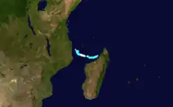 After the remnants of Tropical Depression Eliceca dissipated over Madagascar, an area of disturbed weather persisted over the Mozambique Channel, spawning a low-pressure area near Juan de Nova Island on January 21. Convection greatly increased on the next day, indicating the system became a tropical disturbance. Moving southward, the system became a tropical depression on January 23 as the system organized further, aided by an anticyclone aloft. On January 24, the depression intensified into Tropical Storm Fodah while near Europa Island, and soon after became a severe tropical storm.[1] The MFR estimated peak winds of 100 km/h (60 mph), while the JTWC, which initiated advisories that day as Tropical Cyclone 09S, estimated winds of 85 km/h (55 mph).[3][10] Gusts on Europa Island were less than 110 km/h (70 mph), despite the storm being nearby. A strong band of convection spread along the Madagascar coastline, producing gusts of 180 km/h (110 mph) at Morombe.[1] Fodah also produced 250 mm (9.8 in) of rainfall, as well as high seas.[11] Moving around the ridge, Fodah continued southward, encountering stronger wind shear on January 25. Steady weakening commenced as the convection deteriorated, and Fodah became extratropical on January 26. A trough turned the remnants to the southeast, absorbing it on January 29.[1][10]