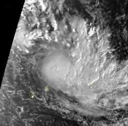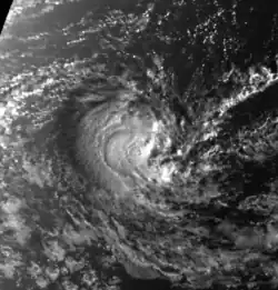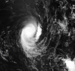 The Intertropical Convergence Zone (ITCZ) became active toward the end of November, spawning a low-pressure area on November 23 about 400 km (250 mi) east of Diego Garcia. This system quickly organized into a tropical disturbance, aided by favorable conditions.[1] On November 24, the JTWC began classifying it as Tropical Cyclone 02S.[3] The next day, the system intensified into Tropical Storm Albertine while moving southwestward, steered by a ridge to the southeast. Late on November 25, an eye developed in the center of the convection, and Albertine intensified to tropical cyclone status the next day. The eye gradually became better organized, attaining a diameter of 90 km (55 mi) on November 28 as Albertine became an intense tropical cyclone.[1] At that time, the MFR estimated peak 10–minute winds of 175 km/h (110 mph),[4] with gusts to 250 km/h (160 mph).[1] In contrast, the JTWC estimated 1–minute winds of 215 km/h (135 mph).[4] After moving over an area of cool water temperatures, Albertine quickly weakened and lost its well-defined eye. On November 30, the center passed about 110 km (68 mi) northwest of Rodrigues after weakening to severe tropical storm status. After weakening gradually, the storm began deteriorating faster due to increasing wind shear. A polar low steered Albertine southeastward until absorbing the system on December 3.[1]