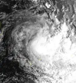 The same broad system that spawned Christelle also produced an area of convection southwest of Diego Garcia toward the end of December. On January 1, the convection began organizing, aided by an anticyclone aloft, and it became a tropical depression on the next day. The system quickly intensified into Tropical Storm Bentha on January 3 while moving generally southwestward.[1] Also on that day, the JTWC classified it as Tropical Cyclone 06S.[3] On January 4, Bentha attained peak winds of 85 km/h (55 mph),[8] and on the same day the storm began interacting with developing Tropical Storm Christelle to the west. On January 5, increased shear weakened Bentha, and by the following day the storm deteriorated into a tropical depression. The system passed about 250 km (155 mi) north of Réunion on January 6, dissipating shortly thereafter near Tromelin Island while being absorbed into Christelle.[1]