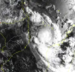 An extended series of low-pressure areas spawned what would become Tropical Storm Josta on March 5 near the Comoros in the northern Mozambique Channel. It initially drifted westward while slowly organizing, becoming a tropical storm on March 7.[1] On that day, the JTWC classified Josta as Tropical Cyclone 16S.[3] On March 8, Josta approached the coast of Mozambique within 90 km (55 mi) of Pemba before turning abruptly to the east-southeast. The convection fluctuated in intensity, eventually becoming better organized on March 9. That day, an eye feature formed in the center of the convection,[1] and the MFR estimated peak winds of 105 km/h (65 mph). By contrast, the JTWC upgraded Josta to the equivalent of a minimal hurricane with winds of 120 km/h (75 mph).[18] The eye feature dissipated soon after due to increased shear, causing Josta to weaken. On March 10, the storm re-intensified slightly, aided by the monsoon, as it passed 160 km (100 mi) south of Mayotte. It again weakened soon thereafter, with the convection spreading ahead of the circulation over Madagascar. On March 12, the circulation dissipated off the northwest coast of Madagascar, partially due to the influence of the stronger Kylie to the southeast.[1] Rains from the storm reached 270 mm (11 in) along the coast of Madagascar, despite the storm not making landfall.[19]