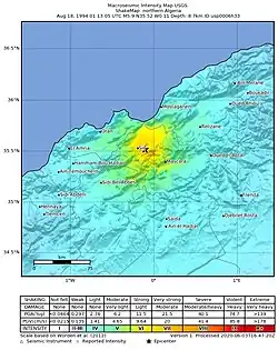 The 1994 Mascara earthquake occurred on August 18 at 02:13 local time with an epicenter in a rural part of Algeria. The earthquake measured 5.8 on the moment magnitude scale (Mw ) and had a depth of 10 km (6.2 mi).[1] It caused the deaths of 171 people, left up to 12,500 homeless, and destroyed thousands of homes in Mascara Province.[2] Many homes were damaged or destroyed due to poor building quality which collapsed on the inhabitants and resulted in a majority of the casualties. The national government launched a rapid response effort in its aftermath.