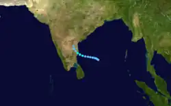 A low-pressure area formed over the western Bay of Bengal on October 28. On the next day, the IMD classified it as a depression, and soon upgraded it to a deep depression. On October 30, the IMD upgraded it further to a cyclonic storm and later a severe cyclonic storm, estimating peak 3–minute winds of 110 km/h (70 mph); this was based on the appearance of a well-defined eye. Also on October 30, the JTWC initiated advisories on the system as Tropical Cyclone 04B north of Sri Lanka. The storm consisted of a consolidating area of thunderstorms, with spiral rainbands. Steered by a ridge to the north, the system moved west-northwestward toward the southeast coast of India. Early on October 31, the storm made landfall in southeastern India near Chennai with winds of 110 km/h (70 mph), according to the IMD, and 85 km/h (55 mph) according to the JTWC. Late on October 31, the storm fell below depression status after weakening over land.[2][1]