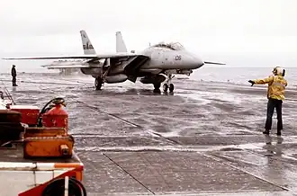 ![]() A US Navy F-14 Tomcat during flight operations aboard the USS Kitty Hawk on 4 December 1994 | |||||||