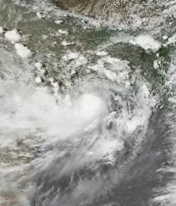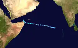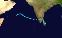 On November 2, a tropical depression developed over Sri Lanka. It drifted southward, northward, then westward over India. On the 10th, it was upgraded to a tropical storm over the Arabian Sea, and it reached its peak of 65 mph (105 km/h) winds the next day. Wind shear caused the storm to dissipate over the open waters on the 14th.