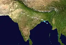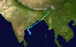 On May 13, a near-equatorial trough developed. The poorly organized system slowly tracked towards the north-northwest. The following day, deep convection consolidated around the center of circulation and the Joint Typhoon Warning Center (JTWC) classified the system as Tropical Cyclone 01B. Favorable upper-level conditions and good outflow allowed the storm to intensify. Shortly after, the cyclone attained tropical storm-force winds and turned towards the northeast. While gradually increasing in forward motion, the storm continued to strengthen. On May 17, the cyclone attained winds of 120 km/h (75 km/h), equivalent to a Category 1 hurricane on the Saffir–Simpson scale. By May 18 an eye developed and the storm reached its peak intensity with winds of 215 km/h (135 mph) before making landfall near Chittagong. After landfall, the storm rapidly tracked northeastward inland and dissipated early on May 20.[1] It caused significant damage and 67 fatalities.[2]