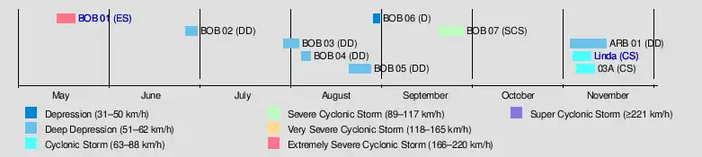 The 1997 North Indian Ocean cyclone season was an average season It had no bounds, but cyclones tend to form between April and December, with peaks in May and November. These dates conventionally delimit the period of each year when most tropical cyclones form in the northern Indian Ocean.