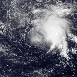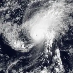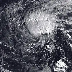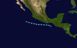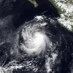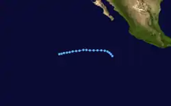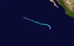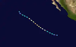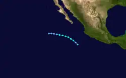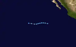 During the third week of August, a tropical disturbance formed far from land. Although the system was located over warmer than average sea surface temperatures, the upper-level environment was initially unfavorable. However the environment gradually became more conducive for tropical cyclone formation and Tropical Depression Twelve-E formed August 25 from an area of disturbed weather in a rather easterly location. It became a tropical storm the next day and a hurricane on August 27. Intensification was rapid, with winds increasing from 75 mph (121 km/h) to 115 mph (185 km/h) in just 6 hours. Continuing to rapidly intensify, it reached its peak intensity as a low-end category 4 hurricane.[35] After maintaining peak intensity for 30 hours, it moved north-northwest and encountered increasing wind shear which reduced its winds from 115 mph (185 km/h) to 35 mph (56 km/h) in just 24 hours. Jimena completely dissipated on August 30, not long after entering the Central Pacific Basin. Hurricane Jimena was of no threat to land.[35]