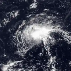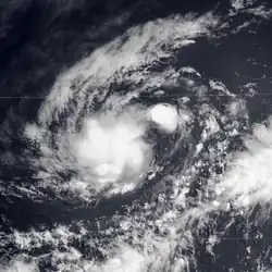 In early July, shower activity increased in association with an area of disturbed weather. With surface pressures lower than normal for a tropical disturbance, deep convection increased further and Tropical Depression Six-E formed late on July 5 and reaching tropical storm status the following day and was named Dolores. Despite moderate wind shear, very cold cloud tops formed as the winds increased to 60 mph (95 km/h), a moderate tropical storm. Moving westward, Dolores strengthened into the first hurricane of the season on July 7 as a ragged eye formed.[17]