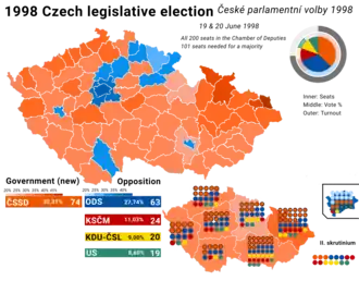 Parliamentary elections were held in the Czech Republic on 19 and 20 June 1998.[1] The Czech Social Democratic Party emerged as the largest party, winning 74 of the 200 seats. Voter turnout was 73.9%.[2]