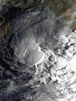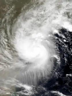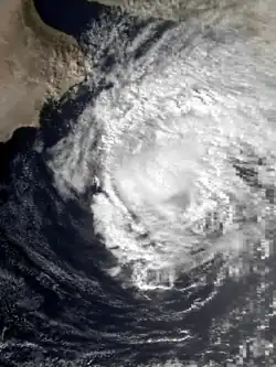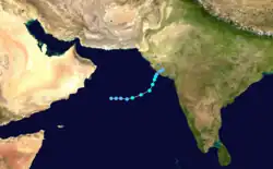 On June 1, an area of low pressure developed over the Laccadive Islands. Two days later, the JTWC issued a TCFA for the system as it became better organized. Early on June 4, the JTWC issued its first advisory on Tropical Cyclone 03A.[6] Around the same time, the IMD began monitoring the system as Depression ARB 02. Shortly after, the depression was upgraded to a deep depression and further strengthened into a cyclonic storm the following day.[15] The small storm moved slowly towards the west and weakened as wind shear began to increase. The storm weakened below tropical storm intensity later that day and the initial final advisory was issued. However, the system redeveloped and advisories resumed the next day. The storm gradually intensified as it moved towards the northwest. Dvorak satellite intensity estimates on June 6 reached T4.0, corresponding to an intensity of 120 km/h (75 mph).[23] The IMD also marked the increase in intensity, upgrading ARB 02 to a severe cyclonic storm.[15] Around this time, the storm began to turn towards the north and accelerate due to an approaching mid-level trough. As the storm neared the Indian coastline, an eye developed and the storm strengthened into the equivalent of a major hurricane with winds reaching 185 km/h (115 mph).[6] The IMD assessed the storm to be a very severe cyclonic storm at this time, with winds up to 165 km/h (103 mph) and a barometric pressure of 958 mbar (hPa).[15] After slightly weakening early on June 9,[23] 03A re-strengthened, attaining its peak intensity with winds of 195 km/h (121 mph).[6] Then it made landfall near Porbandar in the Indian state of Gujarat[23] between 0100 and 0200 UTC.[15] The storm weakened following landfall and the JTWC issued their final advisory later that day.[6] The IMD continued to monitor ARB 02 until June 10, by which time it had weakened to a depression before dissipating.[15]