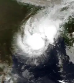 On November 10, an area of low pressure developed over the Bay of Bengal within a monsoonal trough. Moving towards the northwest,[42] the low gradually developed and the JTWC issued a TCFA early on November 13. The next day, the first advisory on Tropical Cyclone 06B was issued.[10] A brief period of rapid development took place as the storm strengthened just below Category 1 status. Shortly before making landfall near Visakhapatnam,[42] 06B reached its peak intensity with winds of 155 km/h (96 mph).[10] At this time, the IMD classified the cyclone as a Very Severe Cyclonic Storm and reported that it had a 60 km (37 mi) wide eye.[43] Rapid weakening followed shortly after landfall and the storm dissipated early on November 16.[10][42]