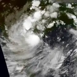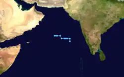 The IMD began monitoring an area of low pressure over the Laccadive Islands on October 10. The low traveled towards the northwest with little development.[7] On October 15, the JTWC issued a TCFA as the system became better organized. Although wind shear increased, the first advisory was issued the next day. With minimal convection, the storm never intensified past 65 km/h (40 mph).[9] The system traveled towards the northeast and weakened due to strong wind shear. On October 17, the storm fell below tropical storm status and made landfall on the Kathiawar Peninsula, near the same area where 03A made landfall in early June.[7] The storm dissipated shortly after landfall.[7][9]