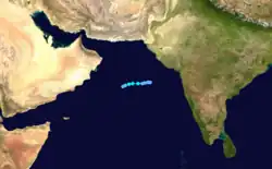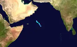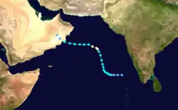 On December 7, a broad area of low pressure developed near southern India within an area of moderate wind shear.[54] On December 11, the JTWC issued a TCFA for the system as it drifted towards the northwest over the Arabian Sea. Two days later, the first advisory on Tropical Cyclone 08A was issued.[13] The large cyclone slowly organized and intensified as it turned towards the north.[54] By December 15, the storm reached its peak intensity with winds of 120 km/h (75 mph).[13] Then, it turned towards the west into an area of higher wind shear.[54] The cyclone gradually weakened as it traveled towards Oman. It made landfall in the country on December 17 with winds of 65 km/h (40 mph) and dissipated later that day.[13] Although it made landfall as a tropical storm, no known damage was reported.[54] The remnants of the storm sank a ship, killing 18 fishermen.[55]
