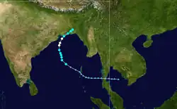 The first storm of the season developed on May 18 out of an area of low pressure over the Bay of Bengal. It reached its peak intensity with winds of 130 km/h (81 mph) before making landfall near Chittagong, Bangladesh. The storm dissipated shortly after.[4] Later that month, a short-lived storm developed over the Arabian Sea and dissipated the next day without impacting land.[5] The most intense storm of the season formed in early June off the southwestern coast of India. It slowly traveled towards the west, remaining relatively weak before turning towards the north and intensifying. The storm reached its peak intensity with winds of 195 km/h (121 mph) shortly before making landfall near Porbandar in the Indian state of Gujarat. The cyclone rapidly dissipated on the same day.[6]