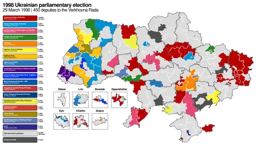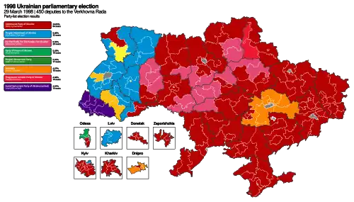 Parliamentary elections were held in Ukraine on 29 March 1998.[2] The Communist Party of Ukraine remained the largest party in the Verkhovna Rada, winning 121 of the 445 seats.[3]