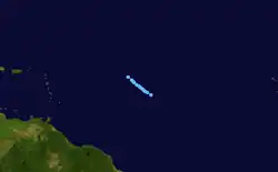 A tropical wave ahead of Hurricane Cindy exited the west coast of Africa on August 15. Minimal development occurred initially, although the structure gradually organized as it approached the Windward Islands. By 06:00 UTC on August 24, the NHC estimated that a tropical depression developed about 470 mi (760 km) east-northeast of Tobago. The depression strengthened into Tropical Storm Emily six hours later. At 1800 UTC on August 24, Emily attained its peak intensity with maximum sustained winds of 50 mph (80 km/h) and a minimum barometric pressure of 1,004 mbar (29.6 inHg).[56] The NHC did not initiate advisories until 2100 UTC, when a reconnaissance aircraft observed winds of 63 mph (101 km/h) in association with the small circulation of Emily. The agency initially predicted that the storm would intensify into a hurricane near the Windward Islands.[57] Increased wind shear generated by Hurricane Cindy caused Emily to weaken slightly on August 25. Emily began moving slowly northwestward and progressively became more influenced by Cindy, developing occasional convective bursts. Later on August 26, the movement turned northward, well offshore the Lesser Antilles. Eventually, the storm no longer produced convective bursts, and by 12:00 UTC on August 28, Emily weakened to a tropical depression. Six hours later, the storm was absorbed into Cindy northeast of the Leeward Islands.[56]