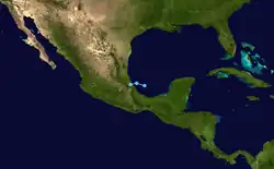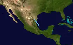 A tropical wave crossed the west coast of Africa on June 20. As the wave moved into the western Caribbean Sea on June 30, a broad cyclonic turning was noted. The system moved over the Yucatán Peninsula on July 1, a day before emerging into the Bay of Campeche as a weak low pressure area. Later on July 2, deep convection became more organized while the system was centered over the southwestern Gulf of Mexico. By 18:00 UTC, the low developed into Tropical Depression Two. Around 04:00 UTC on July 3, the depression made landfall about 40 mi (64 km) south-southeast of Tuxpan, Veracruz, with winds of 35 mph (56 km/h). Eight hours later, it dissipated over the mountains of Mexico.[12] The depression dropped heavy rain on the area amounting to a maximum of 20.37 in (517 mm) at Tanzabaca, San Luis Potosí.[24] In some areas, up to 12.49 in (317 mm) of precipitation fell in 24 hours.[12]