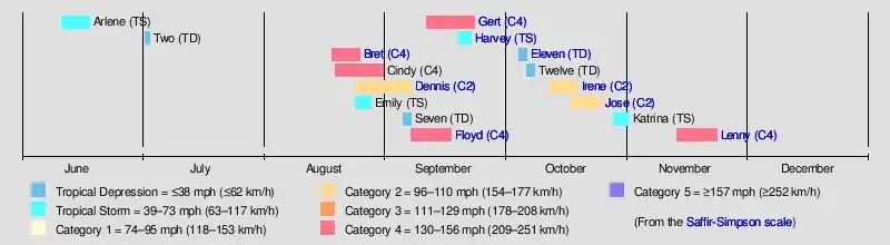 The Atlantic hurricane season officially began on June 1, 1999,[8] and the first tropical cyclone developed on June 11.[10] It was an above–average season in which 16 tropical cyclones formed.[11][12][13][14] Twelve depressions attained tropical storm status, and eight of these became hurricanes. Five hurricanes intensified further into major hurricanes.[11] The season featured a record-tying five Category 4 hurricanes,[15] later tied again in 2005 and 2020.[16] These were Bret, Cindy, Floyd, Gert, and Hurricane Lenny.[11] The last storm of the season, Hurricane Lenny, dissipated on November 23,[17] which was about a week before the official season ending on November 30, 1999.[8]