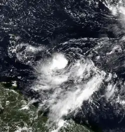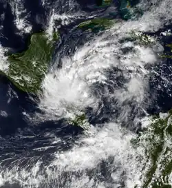 Interaction between a strong monsoon-type flow and a tropical wave in the Bay of Campeche resulted in the development of Tropical Depression Seven on September 5. By 00:00 UTC on September 6, the depression attained maximum sustained winds of 35 mph (56 km/h) and a minimum barometric pressure of 1,006 mbar (29.7 inHg).[13] Shortly thereafter, the center of circulation of the depression became difficult to locate, but was likely heading north-northwestward. Due to warm ocean temperatures, the SHIPS model predicted further intensification, despite the storm having almost no deep convection and being close to land.[58]