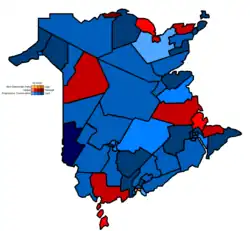Map of New Brunswick's ridings coloured in based on the winning parties and their popular vote | |||||||||||||||||||||||||||||||||||||||||||||||||
