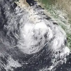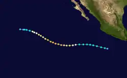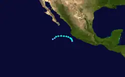 Early on October 9, the center of the storm passed within about 85 miles (137 km) of the coastline between Manzanillo and Cabo Corrientes.[31] The storm then curved west-northwestward and at 1800 UTC on October 9, Irwin attained peaked with winds of 60 mph (97 km/h). Stable air and increasing wind shear caused Irwin to weaken and fall to tropical depression intensity early on October 11. About 12 hours later, the storm dissipated while located about 405 miles (652 km) southwest of Cabo San Lucas.[31] While passing offshore, Irwin brought patches of heavy rainfall to some areas of Mexico, peaking at 9.92 inches (252 mm) in Coahuayutla de Guerrero, Guerrero.[12]