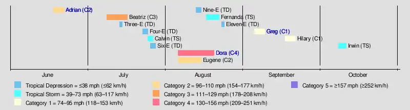 Tropical cyclogenesis began with Hurricane Adrian, which developed on June 18. Although it remained offshore, Adrian brought rough surf and flooding to Mexico, which resulted in 6 fatalities. The storm peaked as a Category 2 before dissipating on June 22. No other tropical cyclones formed in June. Activity halted until July 9, when Hurricane Beatriz developed. Though it peaked as a Category 3 hurricane before dissipating on July 17, the storm caused no damage on land because it remained well offshore. The next system, a short-lived Tropical Depression Three-E, did not result in impact as a tropical cyclone,[2] though the precursor brought heavy rainfall and gusty winds to Central America.[3][4] Tropical Depression Four-E, was the first of three cyclones to cross into the Central Pacific Hurricane Center's area of responsibility, which is between 140°W and the International Date Line.[5] Two other short-lived system in July, Tropical Storm Calvin and Tropical Depression Six-E, caused no damage.[2]