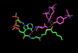 Crystallization of mDECR[7] shows the enzyme provides a network of hydrogen bonds from key residues in the active site to NADPH and the 2,4-dienoyl-CoA which positions the hydride at 3.4 Å to the Cδ, compared with 4.0 Å to the Cβ (not shown). The enolate intermediate discussed earlier is stabilized by residues additional hydrogen bonds to Tyr166 and Asn148. Lys214 and Ser210 (conserved residues in all SDR enzymes) are thought to increase the pKa of Tyr166 and stabilize the transition state.[7] Additionally, at one end of the active site there is a flexible loop that provides sufficient room for long carbon chains. This likely gives the enzyme flexibility to process fatty acid chains of various lengths. Substrate length for mDECR catalysis is thought to be limited at 20 carbons, at which this very long chain fatty acid is first partially oxidized by pDECR in the peroxisome.[9]