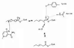 - ^ Fillgrove KL, Anderson VE (October 2001). "The mechanism of dienoyl-CoA reduction by 2,4-dienoyl-CoA reductase is stepwise: observation of a dienolate intermediate". Biochemistry. 40 (41): 12412–12421. doi:10.1021/bi0111606. PMID 11591162.