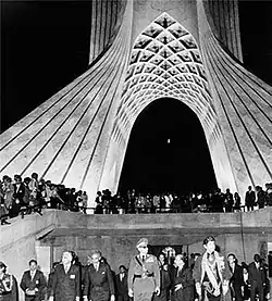 The 2,500-year celebration of the Persian Empire,[1] officially known as the 2,500-year celebration of the Empire of Iran (Persian: جشن‌های ۲۵۰۰ ساله شاهنشاهی ایران, romanizedJašn-hây-e 2500 sale’ šâhanšâhi Irân), was hosted by the Pahlavi dynasty in the Imperial State of Iran in October 1971. Concentrated at Persepolis, it consisted of an elaborate set of grand festivities that sought to honour the legacy of the Achaemenid Empire, which was founded by Cyrus the Great in 550 BC.[2][3] The event was aimed at highlighting ancient Iranian history and also showcasing the country's contemporary advances under Mohammad Reza Pahlavi, who had been reigning as the Shah of Iran since 1941.[4][5] The site brought sixty members of royalty and heads of state from abroad.[6]