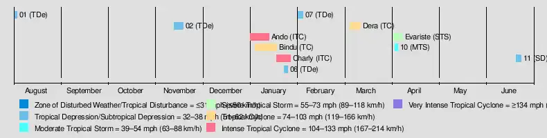 In addition to being the strongest storm, Cyclone Ando was one of two deadly storms during the season. It passed about 205 km (127 mi) west of Réunion, producing 1,255 mm (49.4 in) of rainfall in the mountainous peaks. The rains led to flooding that killed two people. Ando was one of three storms to attain tropical cyclone status – winds of at least 120 km/h (75 mph) – in the month of January. The others were Bindu, which alternated its trajectory several times over open waters, and Charly, which rapidly weakened after encountering hostile wind shear. The next storm to form was Tropical Cyclone Dera, which intensified near Mozambique in early March and killed two people there due to flooding rains. It later moved southward through the Mozambique Channel, maintaining its intensity unusually far to the south before becoming extratropical. There was a month of inactivity in March, including three weeks in which there were no storms worldwide, the first such instance. Subsequently, two storms formed in early April; one was a small, unnamed tropical storm, and the other was Severe Tropical Storm Evariste, which brought light rainfall to two islands. The season ended with an unusual subtropical storm forming rapidly in the southern Mozambique Channel on June 19, the only such storm to form in that body of water in the month. It became the strongest storm on record for so late in the season, although it weakened without affecting land, dissipating on June 24.