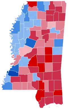 Mississippi was won by Governor George W. Bush with a double-digit margin of victory of 16.92%. Bush won most of the counties and congressional districts of the state. Bush dominated the east part of the state and Gore did well in the west. As of the 2024 presidential election, this is the last election in which Yalobusha County voted for the Democratic candidate. This is also the last election in which Mississippi voted to the right of neighboring Alabama. Bush became the first Republican to win the White House without carrying Adams or Hinds Counties since Richard Nixon in 1968.