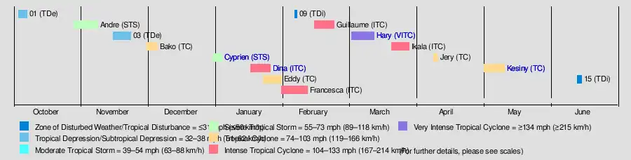 Hary | March 3–13 | Very intense tropical cyclone | 220 km/h (140 mph) | 905 hPa (26.72 inHg) | Madagascar, Mauritius, Réunion | Unknown | 4 | [5] |