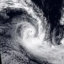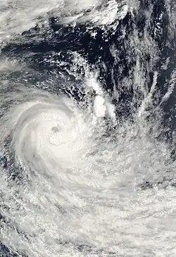 Late on February 16, Guillame began developing a small eye,[5] turning to the east around the same time.[24] With favorable conditions, including good outflow, the system quickly intensified into a compact tropical cyclone as it turned to the southeast. Strengthening briefly stopped on February 17, possible due to an eyewall replacement cycle, although it resumed the following day.[5] Guillame curved to the south and southwest,[24] reaching peak winds of 195 km/h (121 mph) late on February 18;[25] this made it an intense tropical cyclone. The next day, the cyclone passed about 150 km (93 mi) east of Mauritius before an approaching trough turned it to the southeast.[24] Despite the storm's proximity to the island, effects there were modest, marked by winds of 78 km/h (48 mph) and 71 mm (2.8 in) of rain. The cyclone began weakening due to increased wind shear,[5] and deteriorated below tropical cyclone status on February 21. A strengthening ridge turned Guillame toward the northwest, and the storm dissipated on February 23.[5]