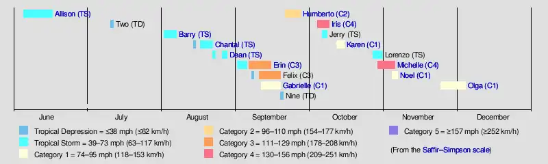 Tropical cyclogenesis began in June, with Tropical Storm Allison forming just offshore Texas on June 5. After Allison transitioned into an extratropical cyclone on June 17, no further activity occurred until Tropical Depression Two developed on July 11. However, the depression dissipated the following day. Another break in activity ensued, which ended on August 2, when Tropical Storm Barry formed in the Gulf of Mexico. August featured two other tropical storms, Chantal and Dean.