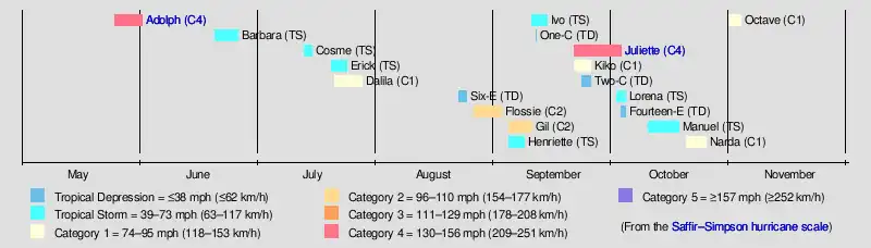The first storm of the season, Hurricane Adolph, formed on May 25 which became the strongest hurricane in the month of May at the time. Tropical Storm Barbara passed just north of Hawaii, bringing minimal impact. The most notable storm that year was Hurricane Juliette, which caused devastating floods in Baja California Peninsula. September was much more active with six systems developing, of which three became hurricanes. Activity decreased appreciably in October and November as most of the storms remained weak and short-lived. The final storm of the season, Hurricane Octave, dissipated on November 3, about twenty-seven days before the official end of the season. Overall, this season was drastically less active and destructive, causing about $401 million in damages and thirteen fatalities.