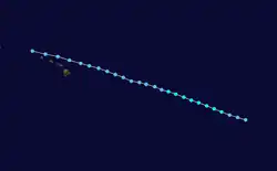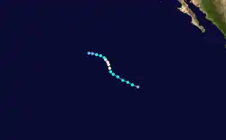 A tropical wave that led to the formation of Atlantic Hurricane Felix over the eastern Atlantic on September 7 also seems to have produced Kiko. This wave moved westward at low latitudes, crossing northern South America and Central America into the East Pacific from September 13 to 16. By September 17, cloudiness and showers increased near the Gulf of Tehuantepec. The area of disturbed weather moved westward for the next few days, without much increase in organization. On September 21, the system's cloud pattern became more consolidated, and curved bands of showers were evident. It is estimated that Tropical Depression Twelve-E had formed that day, at which time it was centered about 634 mi (1,020 km) southwest of the southern tip of Baja California.[47] Located in an environment of easterly vertical shear, the system strengthened slowly. By September 22 the organization of the cloud pattern improved, and the cyclone strengthened into Tropical Storm Kiko. Kiko turned from a northwestward to a west-northwestward heading that day. Although some easterly shear continued to affect the system, very deep convection persisted near the center, and based on Dvorak intensity estimates, Kiko strengthened into a hurricane around September 23. A little later on September 23, deep convection decreased in coverage and intensity and Hurricane Kiko weakened back to a tropical storm.[47] The system continued to fall in intensity on September 24, in part due to the entrainment of more stable air into the circulation. Kiko weakened to a tropical depression on September 25, by which time southwesterly shear also became prevalent. The cyclone degenerated into a westward-moving swirl of low clouds with little or no deep convection later that day. Kiko's remnant low persisted and continued moving generally westward for several more days with intermittent, minor occurrences of deep convection within the circulation. It was finally absorbed into a frontal system to the northeast of the Hawaiian Islands on October 1.[47]