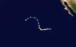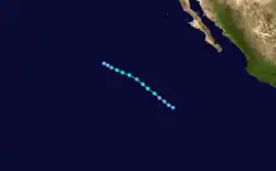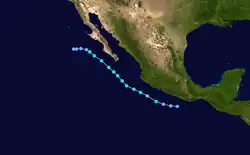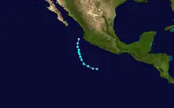 The tropical wave that eventually developed into Lorena moved off the west coast of Africa on September 13. The poorly defined wave tracked rapidly westward across the Atlantic for more than a week. There was little or no thunderstorm activity associated with the wave until it moved across Central America on September 27. Significant deep convection finally developed on September 29 and satellite classifications began on September 30 when the system was located about 300 mi (480 km) south of Acapulco, Mexico. The wave possessed a well-defined closed low-level circulation at that time.[49] Convection steadily increased and banding features developed during the day on October 1. Satellite intensity estimates indicate the system became Tropical Depression Thirteen-E at October 2. Low-level circulation had tightened up considerably and satellite intensity estimates indicated the depression had strengthened into Tropical Storm Lorena about 350 mi (560 km) south-southwest of Acapulco. Lorena reached its peak intensity 60 mph (97 km/h) later that day as it took a more northerly track when it was located about 205 mi (330 km) southwest of Manzanillo, Mexico.[49] By October 4, the forward speed of Tropical Storm Lorena had decreased to around seven to nine mph (11 to 14 km/h) and strong upper-level southwesterly shear began to adversely affect the cyclone. Lorena weakened to a tropical depression and dissipated into a non-convective low later that day about 120 mi (190 km) southwest of Puerto Vallarta, Mexico. The remnant low-level cloud circulation remained offshore and persisted for another day or so before completely dissipating just west of Cabo Corrientes, Mexico.[49]