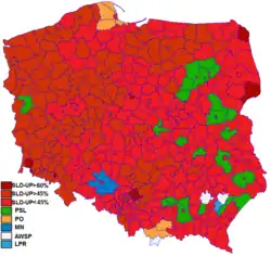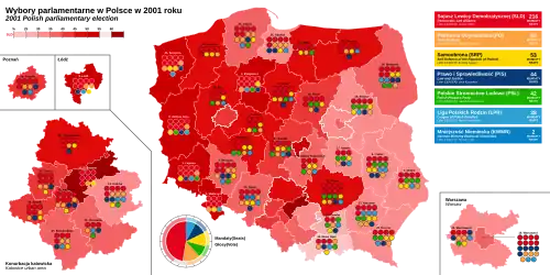 The SLD triumphed in the final tally, receiving 41% percent of the vote, though shy of an outright parliamentary majority in the Sejm.[7] The party increased its representation by 52 seats, earning it 216 representatives, and returned to the Chancellery after a four-year period of sitting in opposition. Partly due to the fractious nature of its opponents, the SLD secured pluralities in all of Poland's voivodeships as well as in an overwhelming majority of the nation's powiats. On the centre right, Civic Platform entered parliament for the first time, coming in second place with nearly 13% of the vote.[7] The party stood relatively strong in Pomeranian Voivodeship.