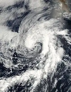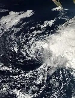 Due to its strong intensity, Elida produced high waves that affected the Mexican coastline.[31] After its peak, the hurricane began to weaken in an irregular fashion. After the inner eyewall dissolved, the intensity of the hurricane decreased to a low-level Category 3 storm, with winds of 120 mph (190 km/h).[40] By this time, Elida had reached the edge of the ridge that kept the cyclone from turning northwest, and a turn to the northwest was beginning. The hurricane proceeded to undergo another eyewall replacement cycle, lowering its intensity to Category 2 intensity.[41] Late on July 26, the eye disappeared from satellite.[42] The weakening trend continued, and Elida weakened to a tropical storm on July 27.[31] At this time, a weakness in the subtropical ridge allowed the storm to make a turn towards the north.[43] Early on July 28, Elida began redeveloping, regaining moderate convection and possibly reintensifying,[44] but eventually, the storm weakened back into a depression early on July 29.[45] On the next day, Elida degenerated into a remnant low, and the last advisory was issued while an area of convection was displaced to the north of the center, with 12-foot (3.7 m) seas in the area.[46] The center was 805 mi (1,296 km) from Punta Eugenia, Mexico when the last advisory was issued.[47] The remnant low of Elida moved northeast and eventually dissipated on July 31, 535 mi (861 km) west of Los Angeles, California.[31]