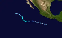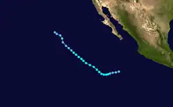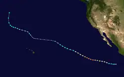 The season officially began on May 15 in Eastern Pacific and on June 1 in Central Pacific; both ended on November 30.[1] In the eastern Pacific, the season saw below average activity in terms of the number of total storms and hurricanes, but about average activity in terms of major hurricanes.[2][3] There were 16 tropical storms in the eastern Pacific Ocean in the season. Of those, eight became hurricanes, of which six became major hurricanes by reaching Category 3 or higher on the Saffir–Simpson scale. Three reached Category 5 intensity,[4] equaling the record set in 1994, and later equaled in 2018.[4][5] Additionally, four tropical depressions formed and dissipated before reaching the intensity of a tropical storm.[6] Three tropical storms formed in the Central Pacific Hurricane Center's area of responsibility, where overall activity was near normal. Two of the storms strengthened into hurricanes, with one of them intensifying into a major hurricane. Two additional systems tracked into the area from the eastern Pacific.[7]