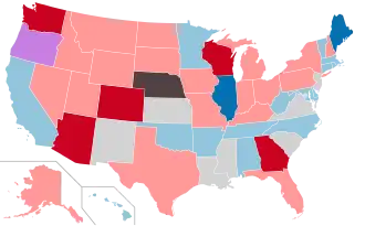 Regularly scheduled elections were held in 91 of the 99 state legislative chambers in the United States. Nationwide, regularly scheduled elections were held for 6,381 of the 7,383 legislative seats. Many legislative chambers held elections for all seats, but some legislative chambers that use staggered elections held elections for only a portion of the total seats in the chamber.[6] The chambers not up for election either hold regularly scheduled elections in odd-numbered years, or have four-year terms and hold all regularly scheduled elections in presidential midterm election years.