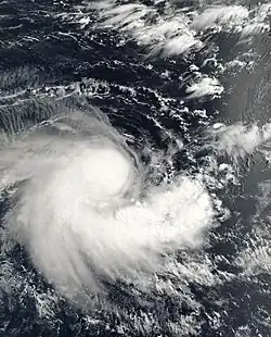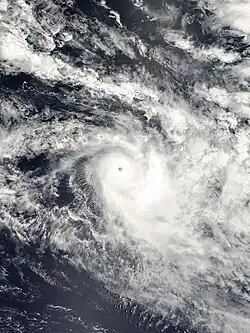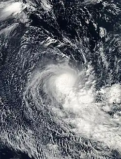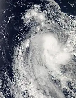 A central dense overcast organized over Helma's center, briefly developing an eye feature on March 11. That day, the MFR estimated peak winds of 110 km/h (70 mph), making Helma a severe tropical storm. The JTWC, which designated the system Tropical Cyclone 17S, upgraded Helma to the equivalent of a minimal hurricane with peak winds of 120 km/h (75 mph). An approaching trough increased wind shear and caused the storm to weaken, leaving the center exposed by late on March 12. After turning to the south, Helma turned back to the southwest as a weakened depression, later turning to the southeast ahead of a cold front. The circulation dissipated on March 16 without affecting land.[2][18]