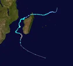 Similar to the preceding season, the 2003–04 season began in September and ended the following May, making it one of the lengthiest on record. Most storms originated near the Chagos Archipelago in the central Indian Ocean.[2] Two storms – Helma and Itseng – crossed from the Australian basin and were tracked by the Bureau of Meteorology (BoM).[4][5] Many of the storms had unusual trajectories, with sudden changes in direction. Cyclone Elita crossed the coastline of Madagascar three times, described by the MFR as an "exotic" track but akin to Cyclone Felicie in 1971. The final storm – Juba – was the third-latest named storm on record, after Ikonjo in May 1990 and Gritelle in June 1991.[2] Through 2003, three tropical cyclones formed outside the cyclone season in the basin, becoming at the time the highest off-season tropical storms in the year. However, this record was surpassed in 2024 with a record high of four named storms.