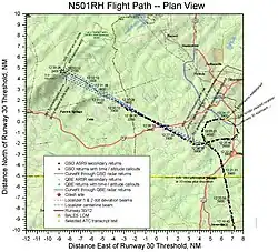 The King Air took off from Concord, North Carolina, at 11:57 am EST, carrying eight passengers and two flight crew. At the time, a low level overcast system persisted throughout the region requiring the pilots to shoot the localizer 30 approach. Due to a plane landing ahead of them, the aircraft entered a hold over the initial approach fix BALES at 4,000 ft. Just as the aircraft was turning outbound on the hold, ATC cleared the pilots for the approach and to descend to 2,600 ft. The plane flew over BALES at 4,000 ft and did not begin descending until 2 nm past BALES. The aircraft then passed the MAP at 2,600 ft and reached the MDA of 1,400 ft after overflying the airport by 4 nm. 1 minute and 13 seconds later, the plane began climbing and at 12:33 pm radioed to ATC that it was going missed. 9 seconds later, the aircraft disappeared from radar.[5]