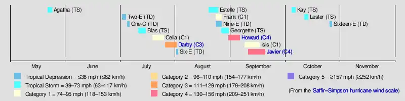 The season's first storm, Agatha, developed on May 22.[9] No tropical cyclones developed during June, below the average of 2 named storms and 1 hurricane, and also the first time since 1969 that the month was cyclone-free.[10] The first hurricane of the season was Celia, which briefly reached Category 1 strength on July 22.[11] It was soon followed by Darby, the first major Hurricane of the season and the first in the Eastern Pacific since Kenna in 2002.[12] Later, on September 14, Javier attained sustained winds of 150 mph (240 km/h), making it the strongest hurricane of the season.[13]