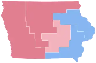 Kerry's strength in the state lay in the highly populated counties of Polk (Des Moines), Linn (Cedar Rapids), Scott (Davenport), Johnson (Iowa City), and Black Hawk (Waterloo). Johnson County, home to the University of Iowa, gave Kerry 64.01% of its vote, Kerry's best performance in the state. However, Kerry also did well in a series of rural and small-town counties in northeastern Iowa and along the Mississippi River, many of which had been traditionally Democratic since at least the 1980s.[8] He won eight of the ten counties along the Mississippi River, including Dubuque County, which had given Gore his margin in the state in 2000. The 1st and 2nd congressional districts were both carried by Kerry, despite being represented by Republicans in Congress.[9] Dubuque is located within the 1st district while the 2nd district contains Cedar Rapids, Iowa City, and Muscatine.[10]