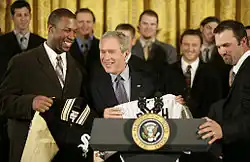 Manager Ozzie Guillén then led the White Sox to a World Series victory, their first in 88 years. Slugger Frank Thomas was not on the post-season roster because he was injured, but the team honored his perennial contributions to the franchise during Game 1 of the Division Series against the Red Sox when he was chosen to throw out the ceremonial first pitch. "What a feeling," Thomas said. "Standing all around the place. People really cheering me. I had tears in my eyes. To really know the fans cared that much about me – it was a great feeling. One of my proudest moments in the game."[2]